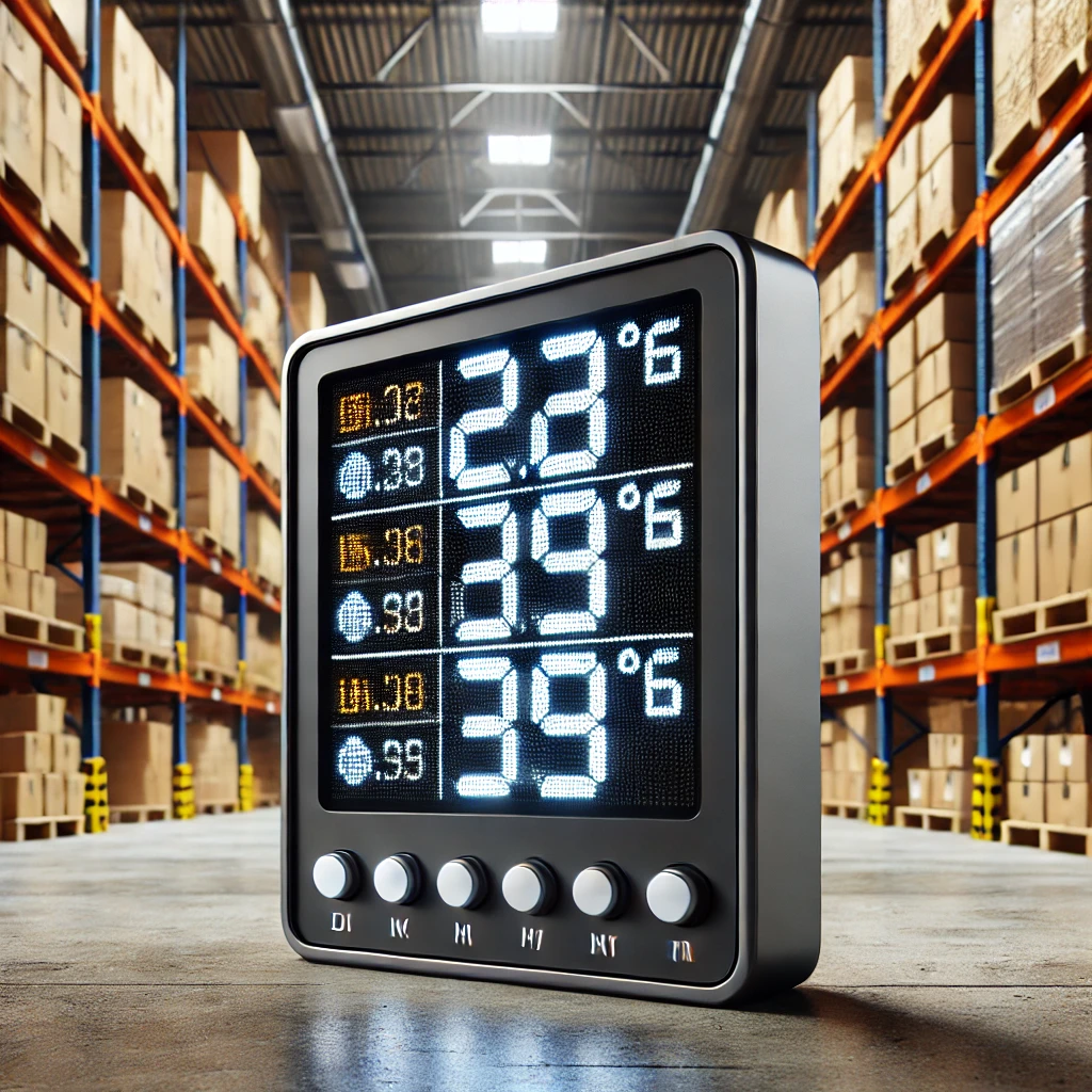 DALL·E 2025-01-17 10.15.44 – A digital LED temperature and humidity display panel, identical to the ones in the user’s provided images, placed in front of a warehouse background.