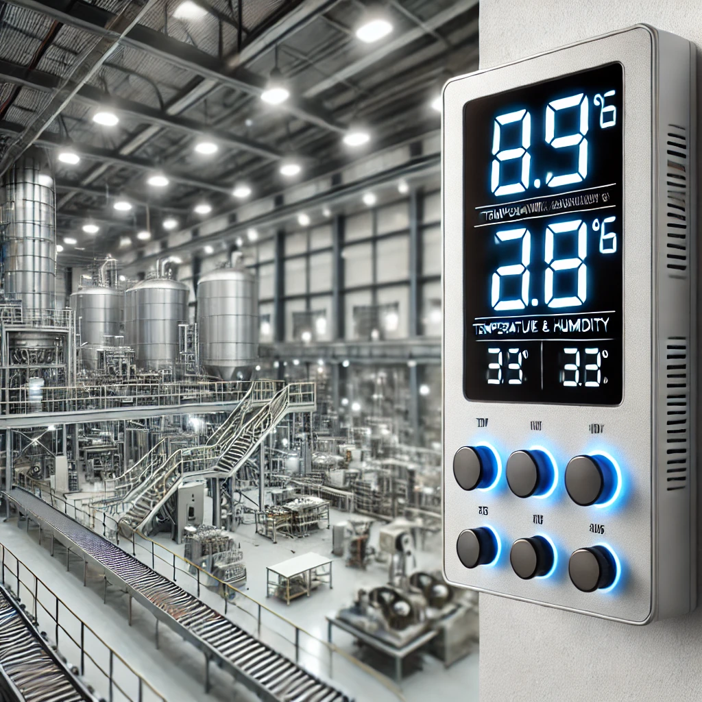 DALL·E 2025-01-17 10.21.19 – A digital LED temperature and humidity display panel mounted inside a modern factory. The factory background features large machinery, conveyor belts,
